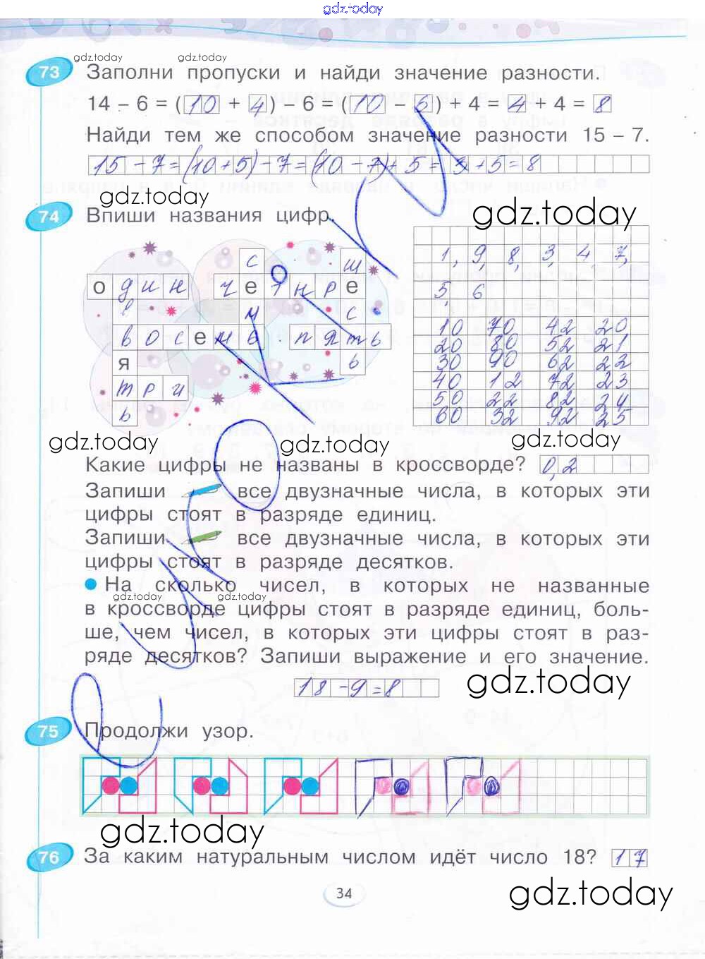 На страницах сайта gdz.today вы найдете учебный и вспомогательный материал, направленный на улучшения знаний школьной программы. ГДЗ - онлайн мир знаний Решение к части 4. Страницы 34 Рабочей тетради по Математике для 1 класса Бененсон Фёдоров 2015