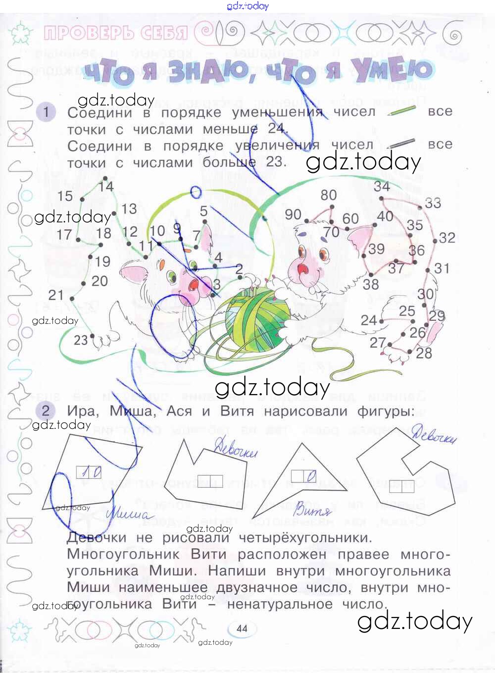 На страницах сайта gdz.today вы найдете учебный и вспомогательный материал, направленный на улучшения знаний школьной программы. ГДЗ - онлайн мир знаний Решение к части 4. Страницы 44 Рабочей тетради по Математике для 1 класса Бененсон Фёдоров 2015