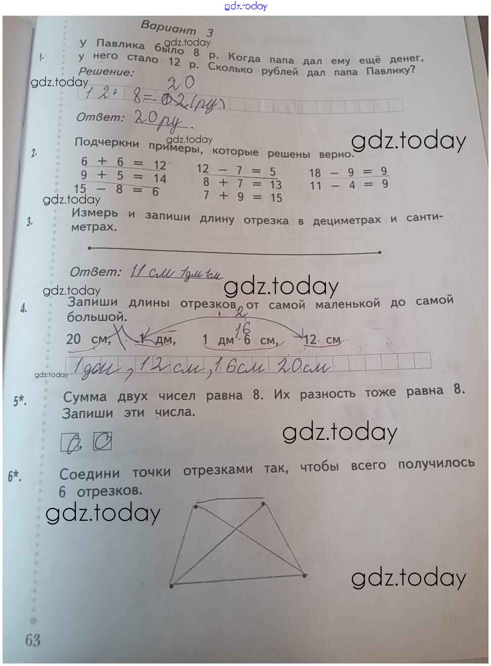На страницах сайта gdz.today вы найдете учебный и вспомогательный материал, направленный на улучшения знаний школьной программы. ГДЗ - онлайн мир знаний Страницы (решение) 63 Тетради для проверочных работ по Математике для 1 класса Рудницкая Вентана-граф Начальная школа XXI века 2020