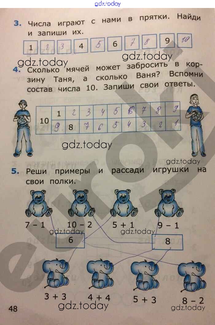 На страницах сайта gdz.today вы найдете учебный и вспомогательный материал, направленный на улучшения знаний школьной программы. ГДЗ - онлайн мир знаний Решение к части 1. Страницы 48 Самостоятельным работам по Математике для 1 класса Самсонова Экзамен УМК 2014