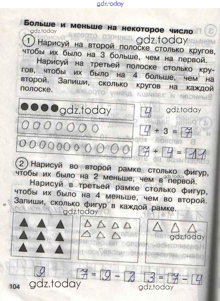 На страницах сайта gdz.today вы найдете учебный и вспомогательный материал, направленный на улучшения знаний школьной программы. ГДЗ - онлайн мир знаний Решение к тетради №2. Страницы 104 Тетради для самостоятельной работы по Математике для 1 класса Захарова, Юдина Академкнига Перспективная начальная школа 2016