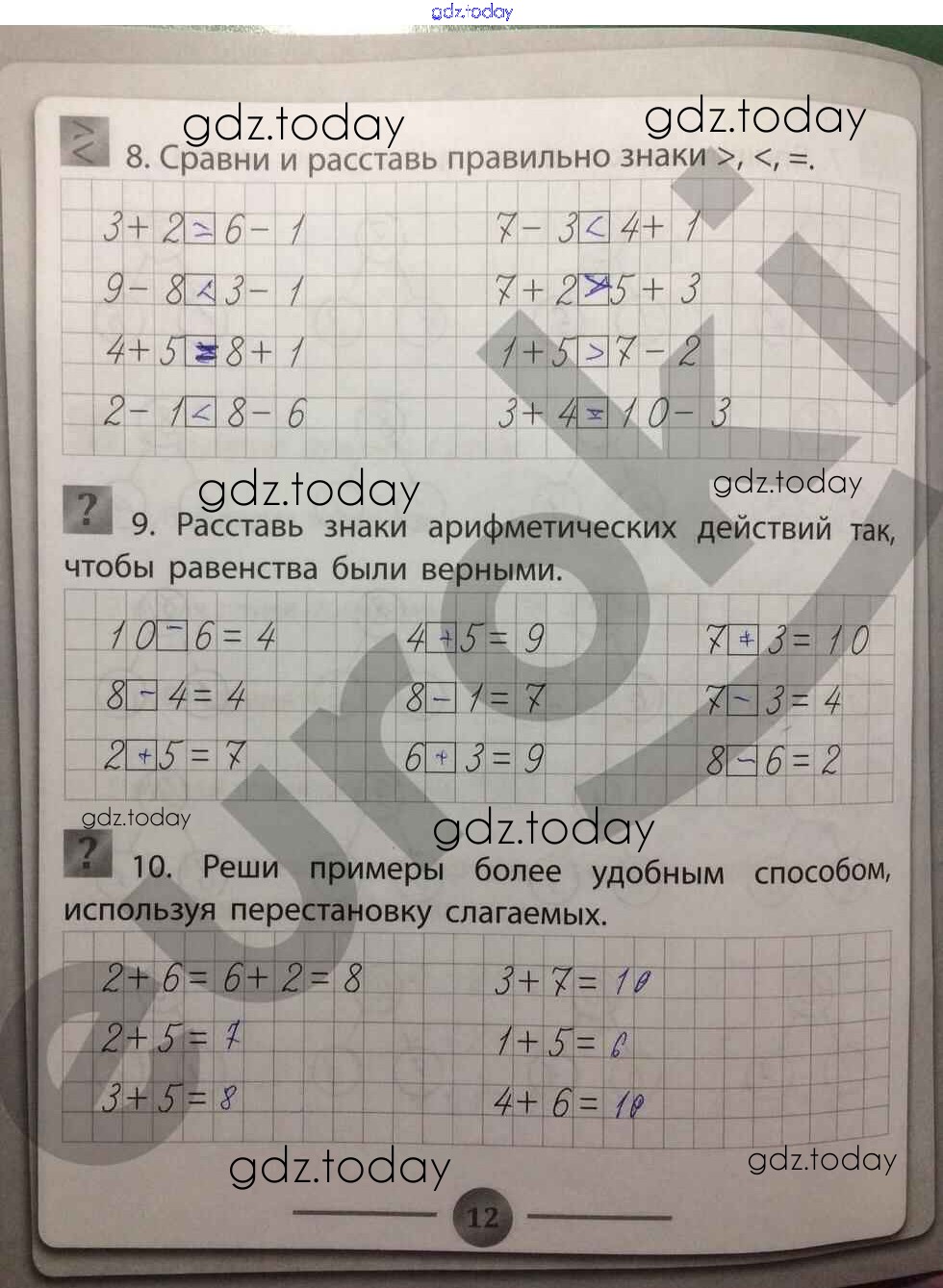 На страницах сайта gdz.today вы найдете учебный и вспомогательный материал, направленный на улучшения знаний школьной программы. ГДЗ - онлайн мир знаний Страницы (решение) 12 Тренажёру по Математике для 1 класса Губка Феникс 2017