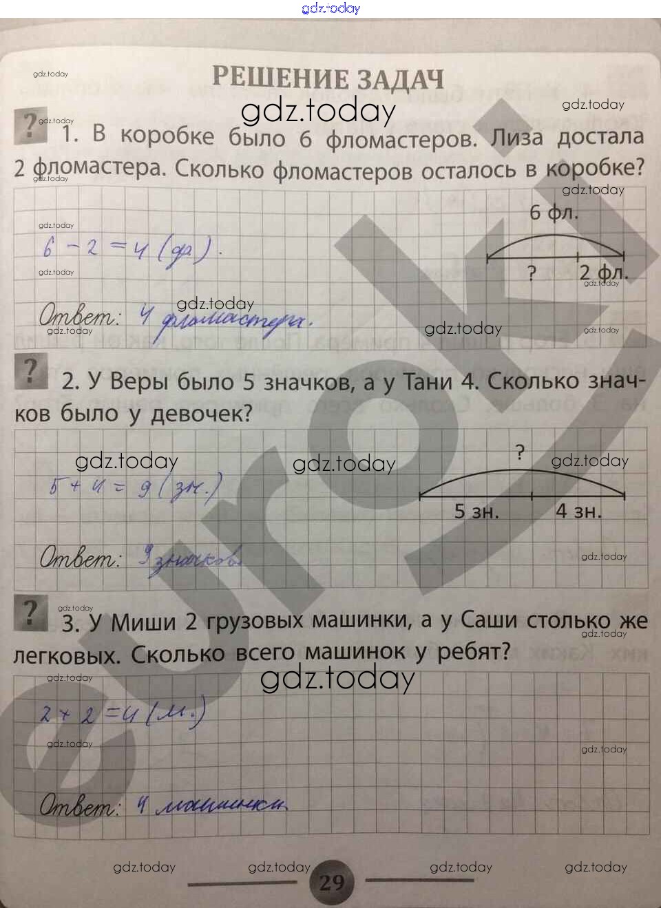 На страницах сайта gdz.today вы найдете учебный и вспомогательный материал, направленный на улучшения знаний школьной программы. ГДЗ - онлайн мир знаний Страницы (решение) 29 Тренажёру по Математике для 1 класса Губка Феникс 2017