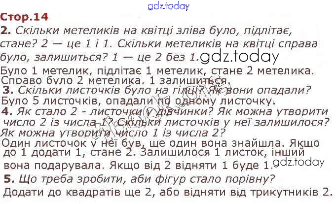 На страницах сайта gdz.today вы найдете учебный и вспомогательный материал, направленный на улучшения знаний школьной программы. ГДЗ - онлайн мир знаний Рішення до Нумерація чисел від 1 до 10 (Сторінки) 14 Учебнику по Математике для 1 класса Лишенко, Тарнавська Генеза 2018