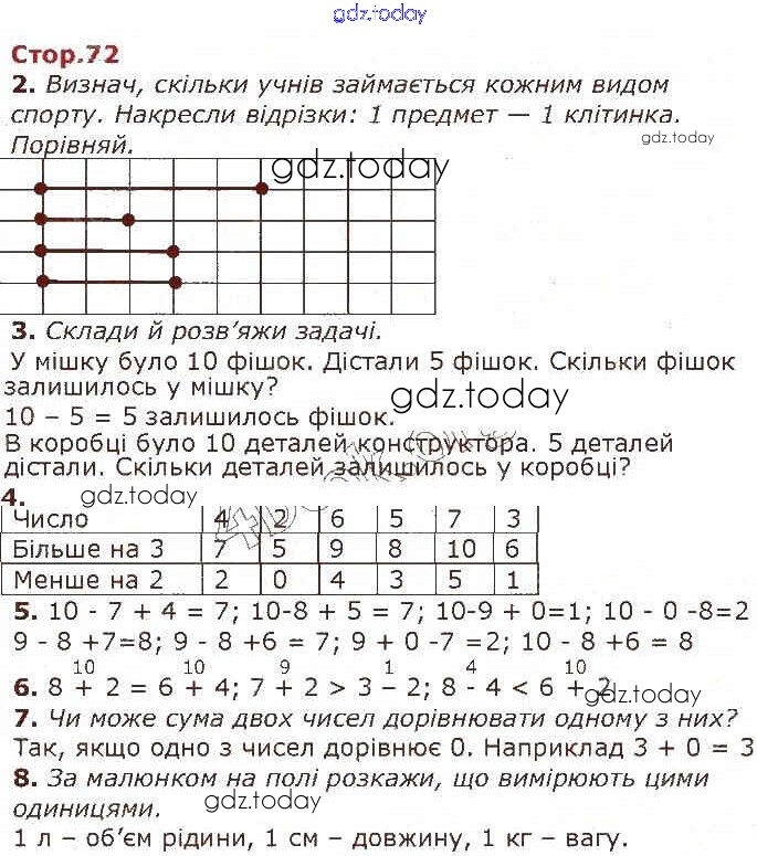 Ответы к Рішення до Додавання і віднімання в межах 10 (Сторінки) 72 Учебнику по Математике для 1 класса Лишенко, Тарнавська Генеза 2018