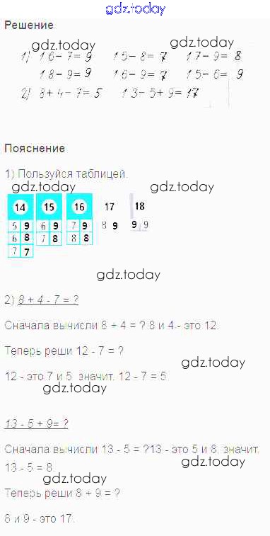 1. Вычисли. 16 - 7 = 18 - 9 = 15 - 8 = 16 - 9 = 17 - 9 = 15 - 6 =
