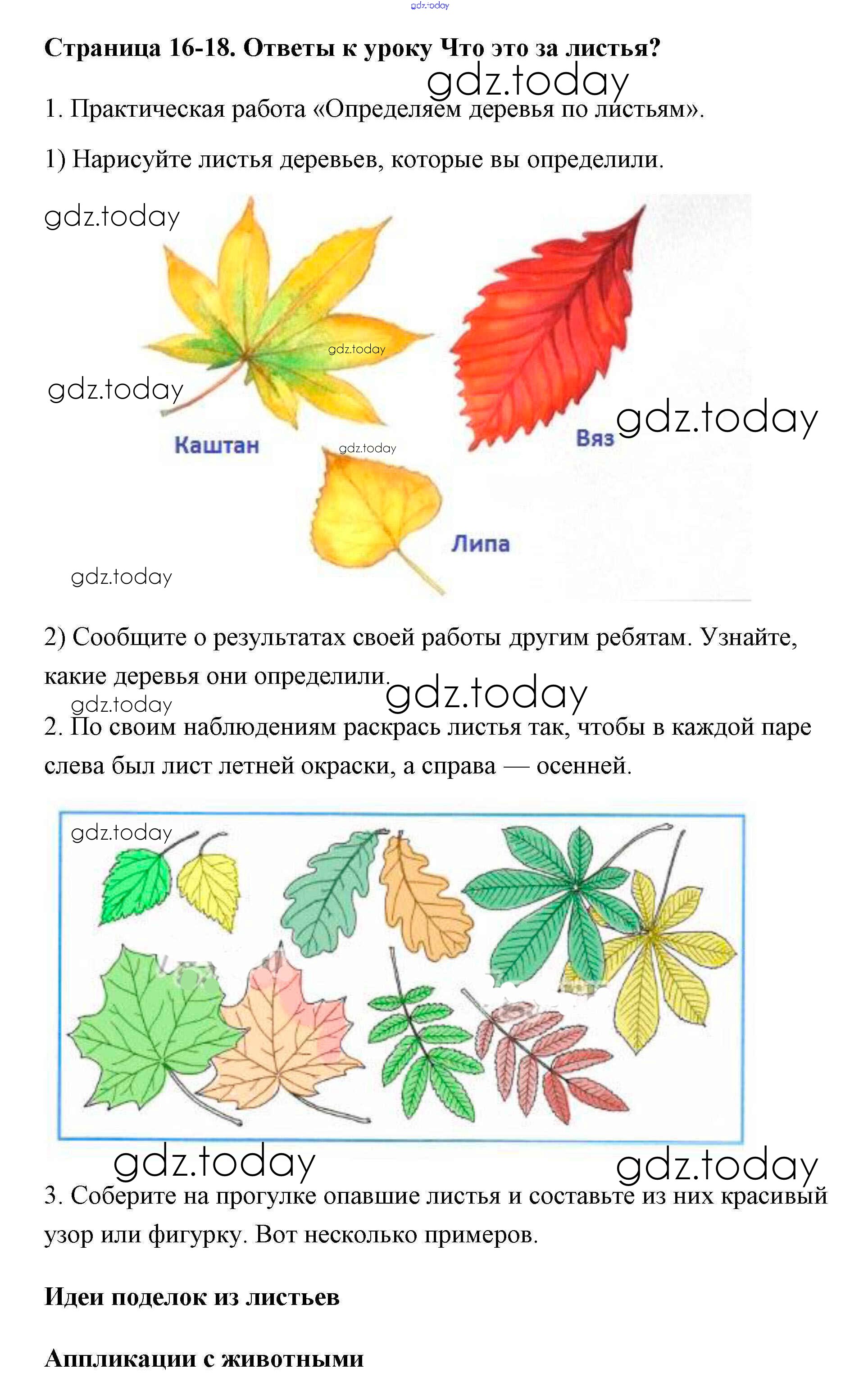 На страницах сайта gdz.today вы найдете учебный и вспомогательный материал, направленный на улучшения знаний школьной программы. ГДЗ - онлайн мир знаний Решение к части 1 (Страницы) 16-18 Рабочей тетради по Окружающему миру для 1 класса Плешаков Просвещение Школа России 2016