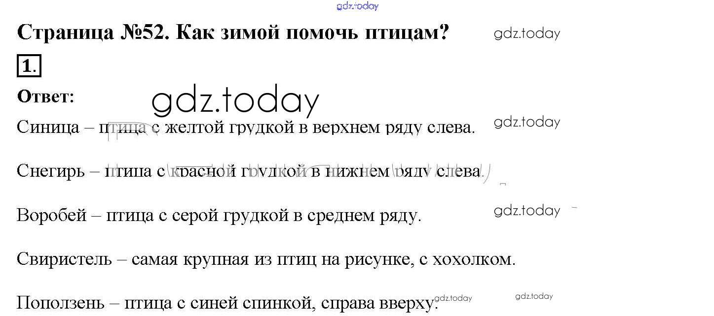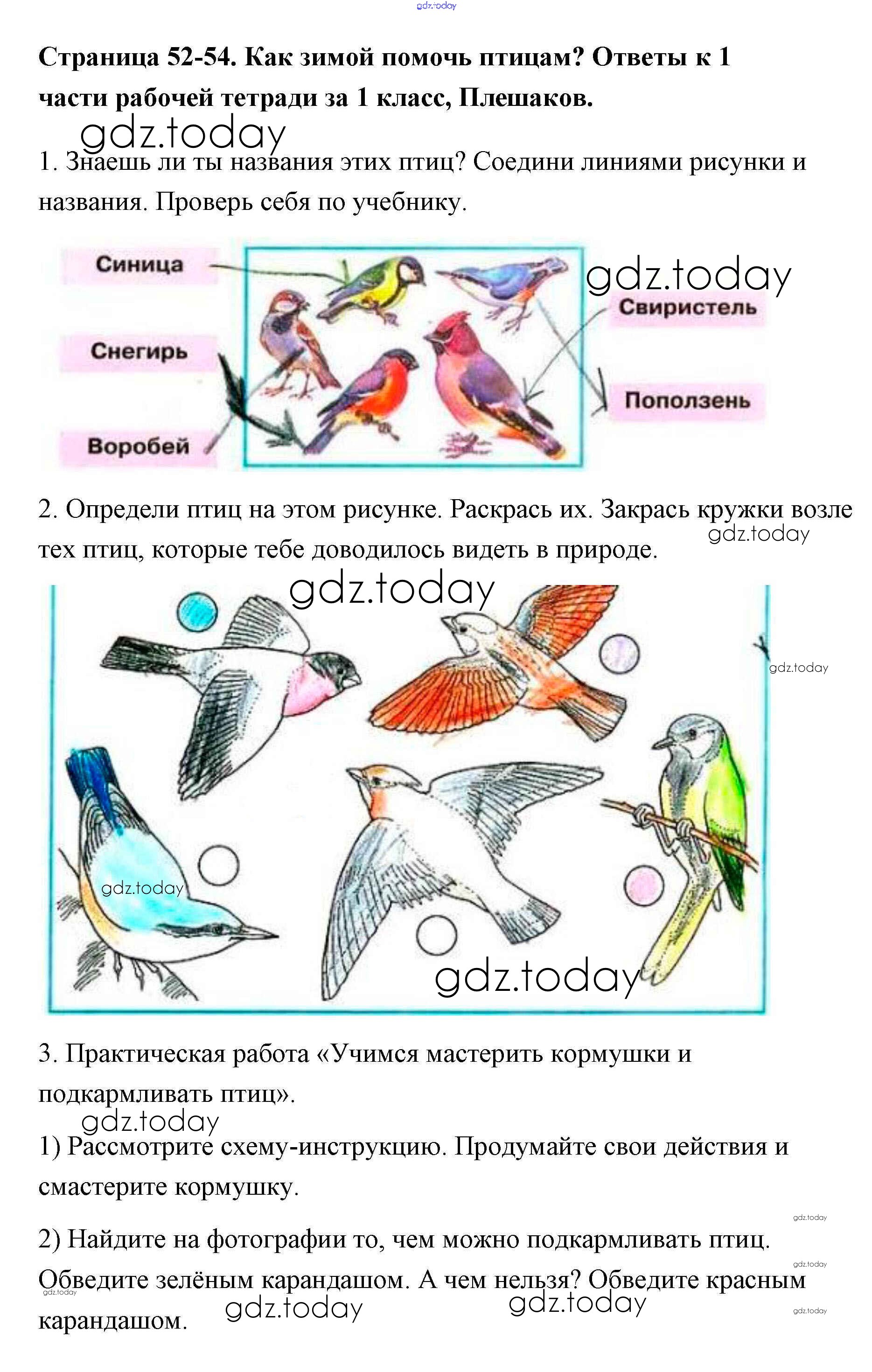 На страницах сайта gdz.today вы найдете учебный и вспомогательный материал, направленный на улучшения знаний школьной программы. ГДЗ - онлайн мир знаний Решение к части 1 (Страницы) 52-54 Рабочей тетради по Окружающему миру для 1 класса Плешаков Просвещение Школа России 2016