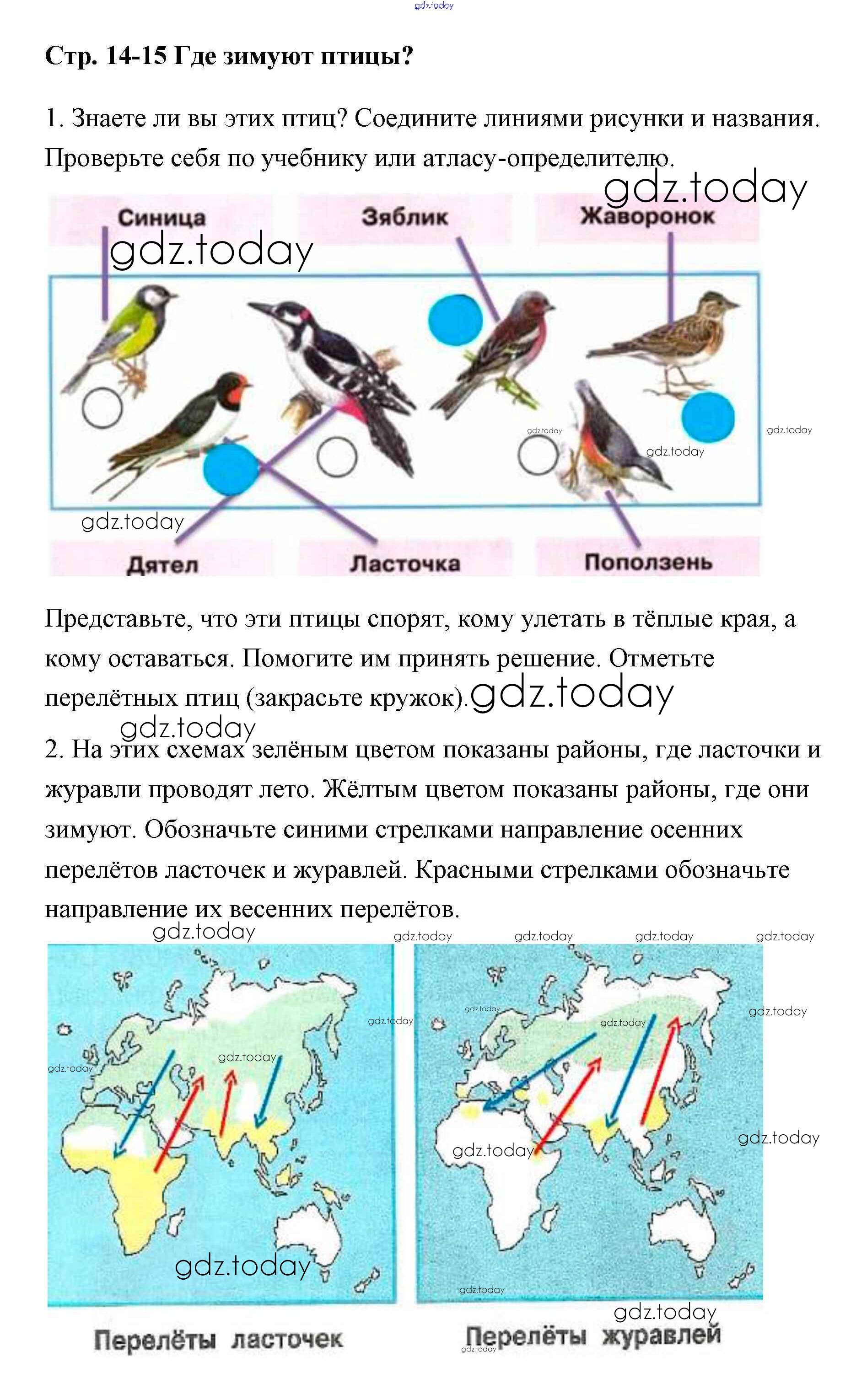 На страницах сайта gdz.today вы найдете учебный и вспомогательный материал, направленный на улучшения знаний школьной программы. ГДЗ - онлайн мир знаний Решение к части 2 (Страницы) 14-15 Рабочей тетради по Окружающему миру для 1 класса Плешаков Просвещение Школа России 2016