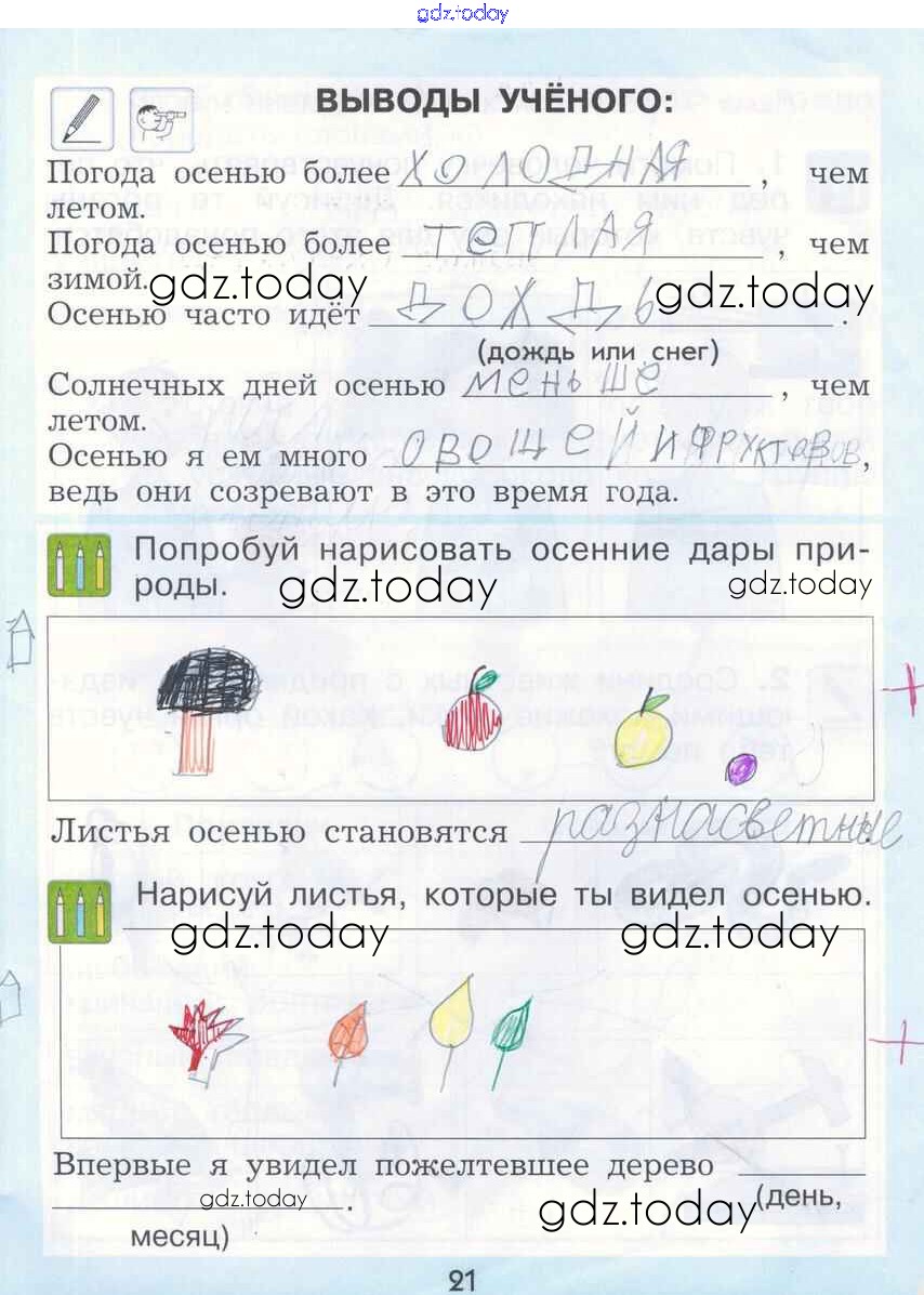 На страницах сайта gdz.today вы найдете учебный и вспомогательный материал, направленный на улучшения знаний школьной программы. ГДЗ - онлайн мир знаний Страницы (решение) 21 Рабочей тетради по Окружающему миру для 1 класса Вахрушев, Бурский Баласс Школа 2100 2015