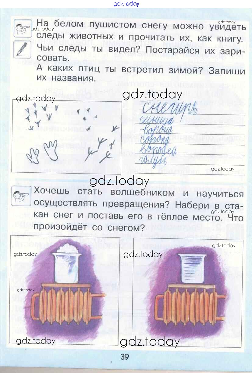 На страницах сайта gdz.today вы найдете учебный и вспомогательный материал, направленный на улучшения знаний школьной программы. ГДЗ - онлайн мир знаний Страницы (решение) 39 Рабочей тетради по Окружающему миру для 1 класса Вахрушев, Бурский Баласс Школа 2100 2015
