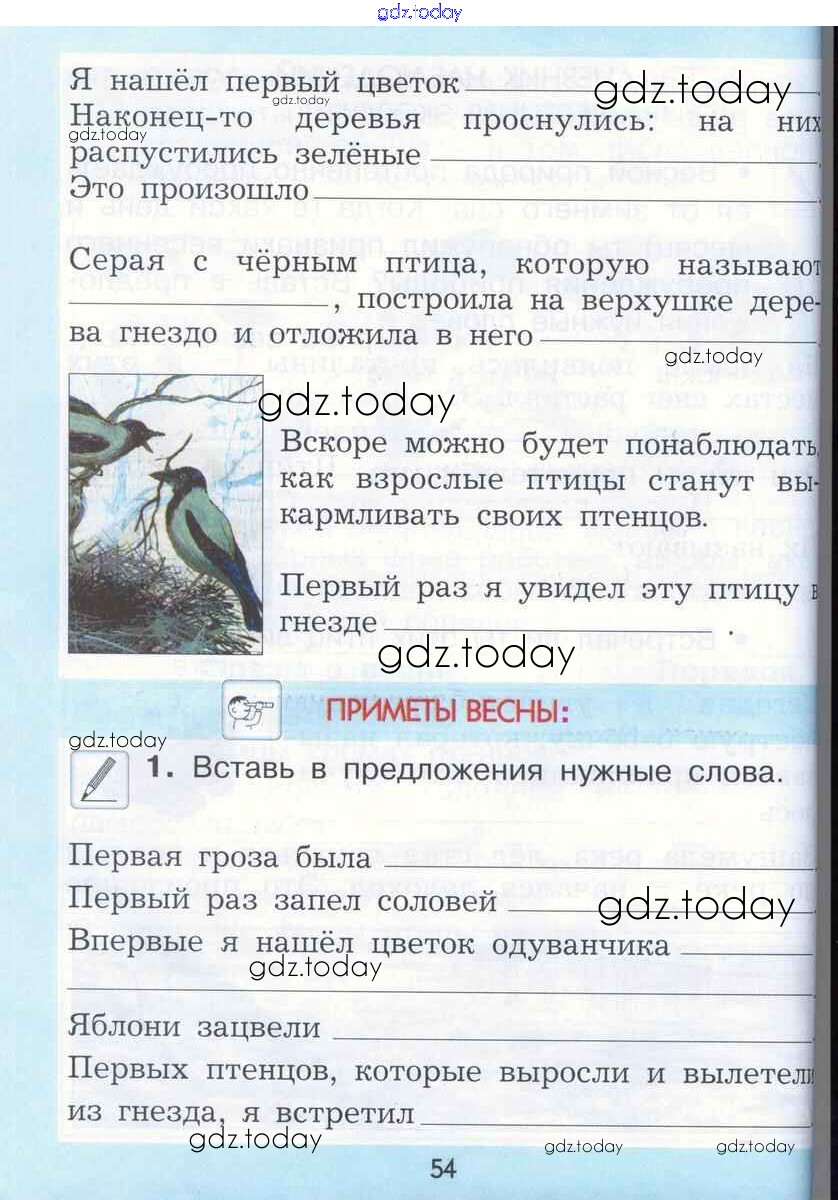 На страницах сайта gdz.today вы найдете учебный и вспомогательный материал, направленный на улучшения знаний школьной программы. ГДЗ - онлайн мир знаний Страницы (решение) 54 Рабочей тетради по Окружающему миру для 1 класса Вахрушев, Бурский Баласс Школа 2100 2015