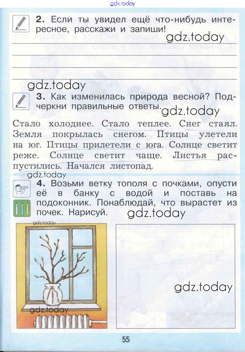 На страницах сайта gdz.today вы найдете учебный и вспомогательный материал, направленный на улучшения знаний школьной программы. ГДЗ - онлайн мир знаний Страницы (решение) 55 Рабочей тетради по Окружающему миру для 1 класса Вахрушев, Бурский Баласс Школа 2100 2015