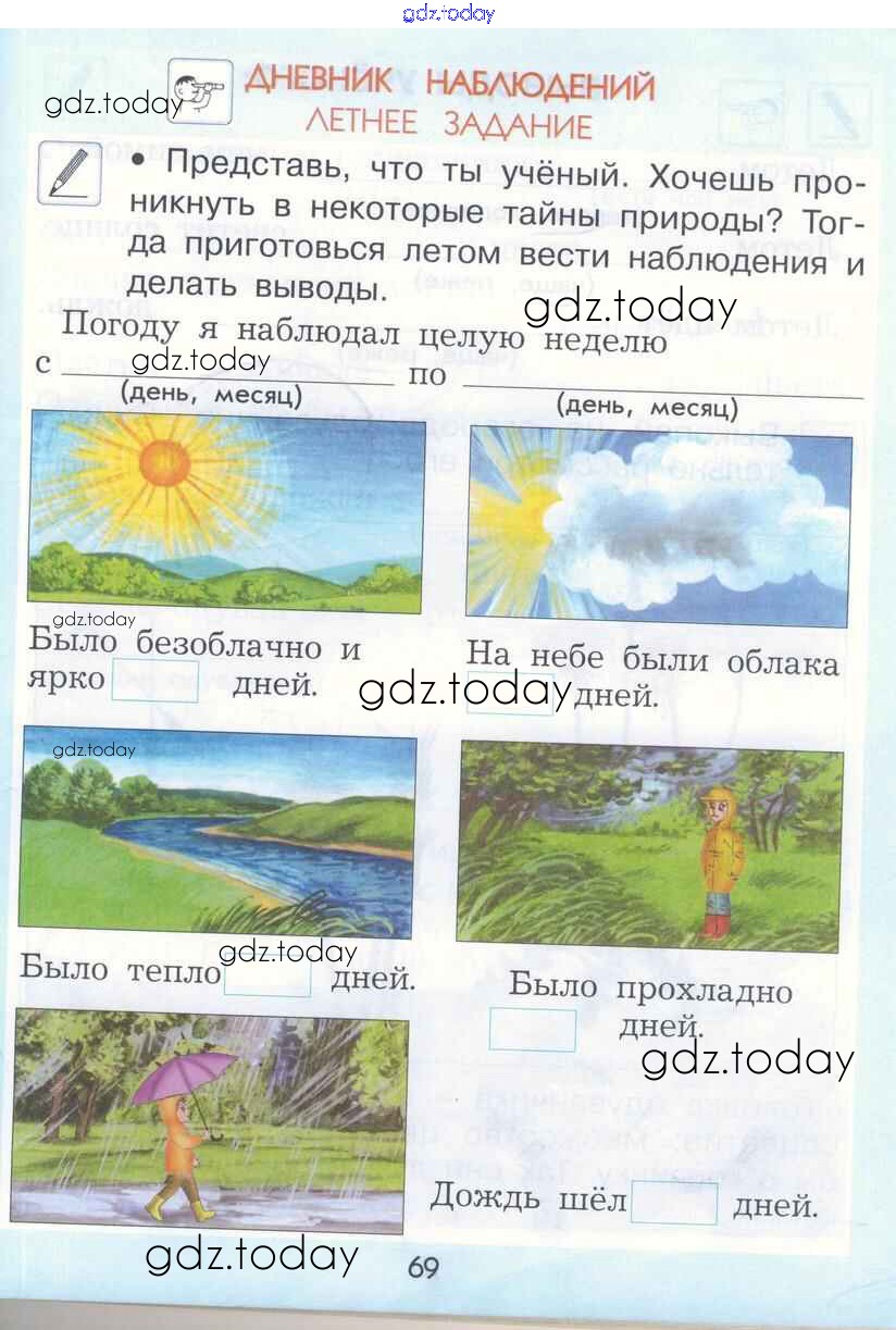 На страницах сайта gdz.today вы найдете учебный и вспомогательный материал, направленный на улучшения знаний школьной программы. ГДЗ - онлайн мир знаний Страницы (решение) 69 Рабочей тетради по Окружающему миру для 1 класса Вахрушев, Бурский Баласс Школа 2100 2015