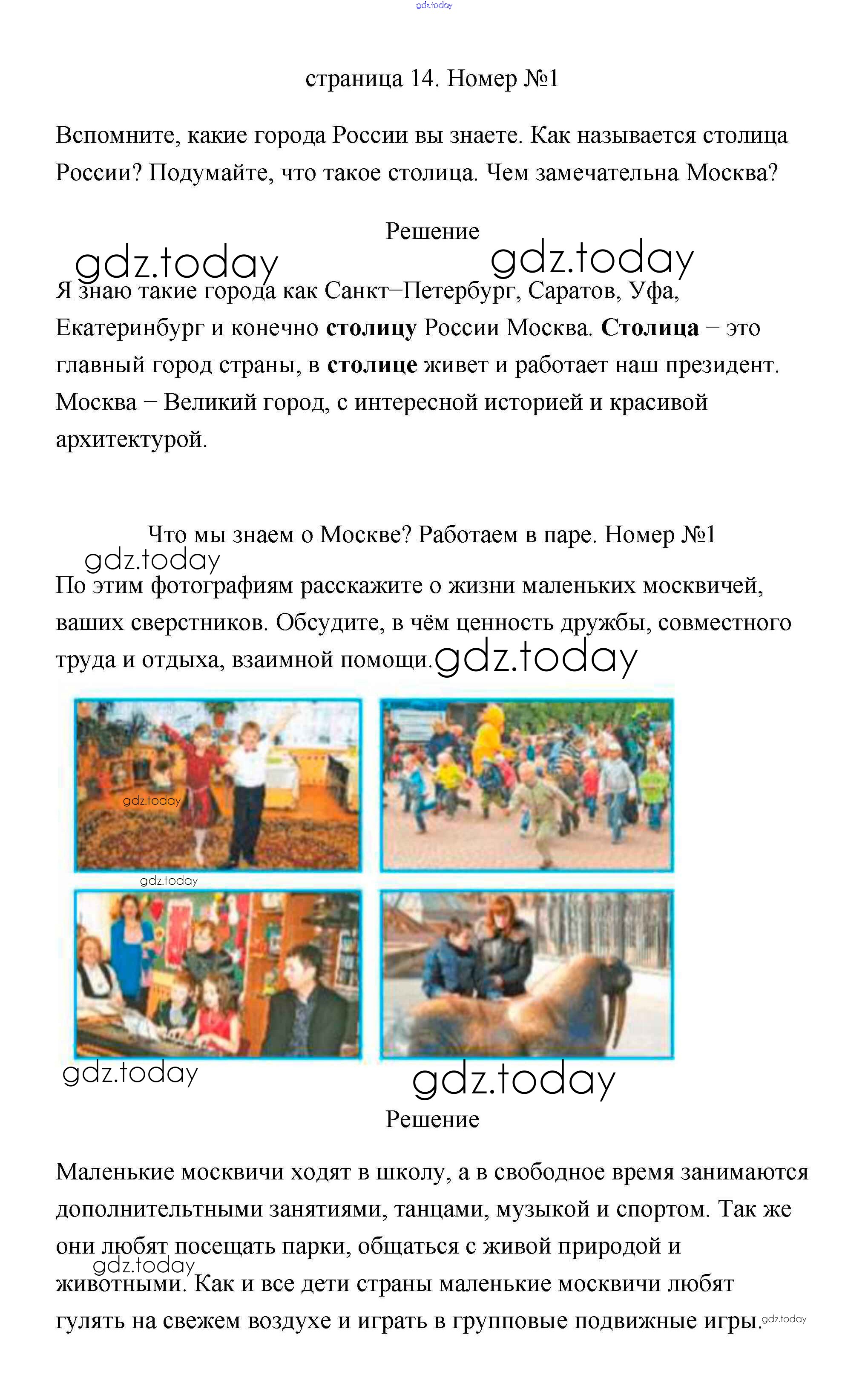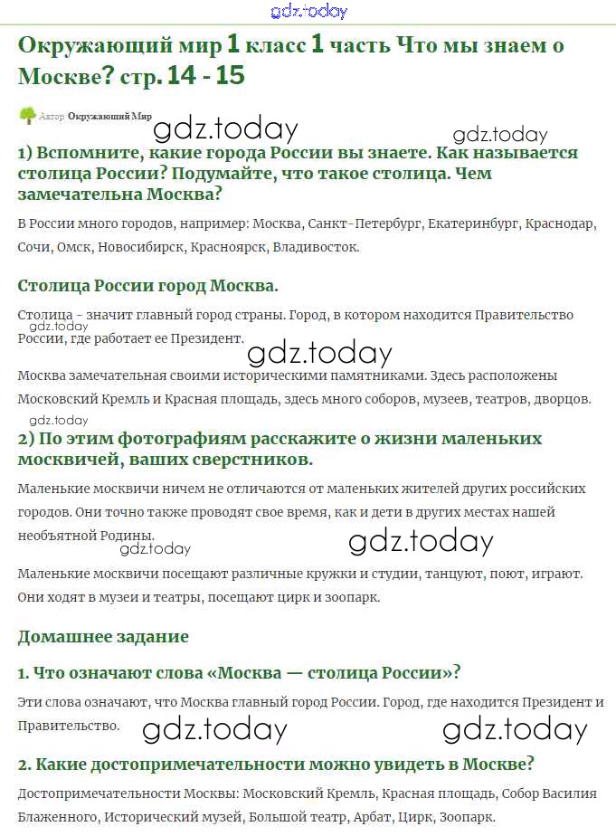 На страницах сайта gdz.today вы найдете учебный и вспомогательный материал, направленный на улучшения знаний школьной программы. ГДЗ - онлайн мир знаний Решение к части 1 (Страниицы) 14-15 Учебнику по Окружающему миру для 1 класса Плешаков Просвещение Школа России 2017