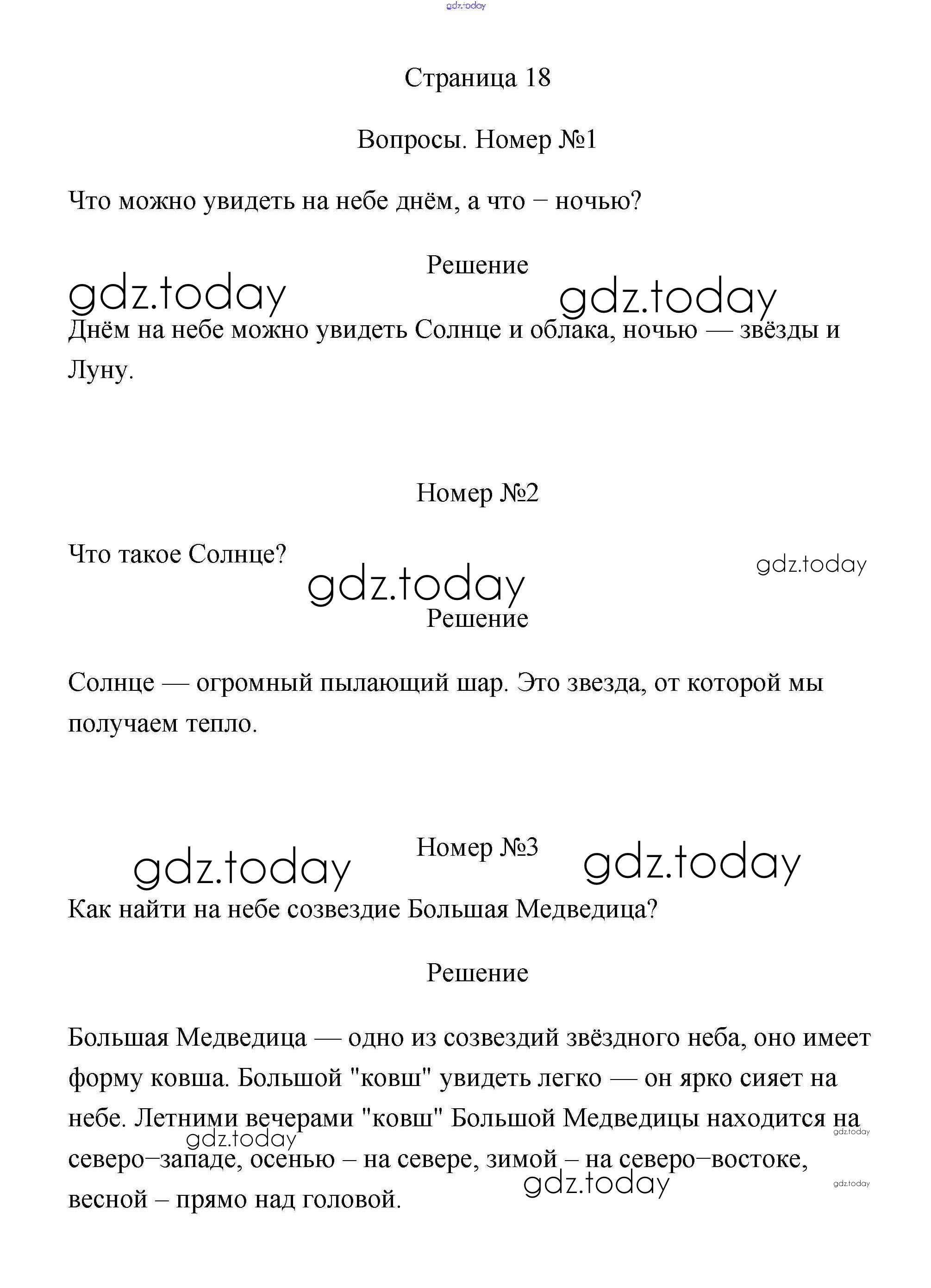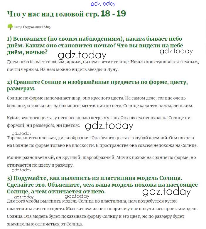 На страницах сайта gdz.today вы найдете учебный и вспомогательный материал, направленный на улучшения знаний школьной программы. ГДЗ - онлайн мир знаний Решение к части 1 (Страниицы) 18-19 Учебнику по Окружающему миру для 1 класса Плешаков Просвещение Школа России 2017