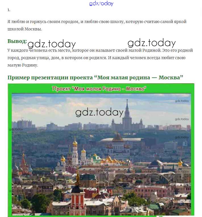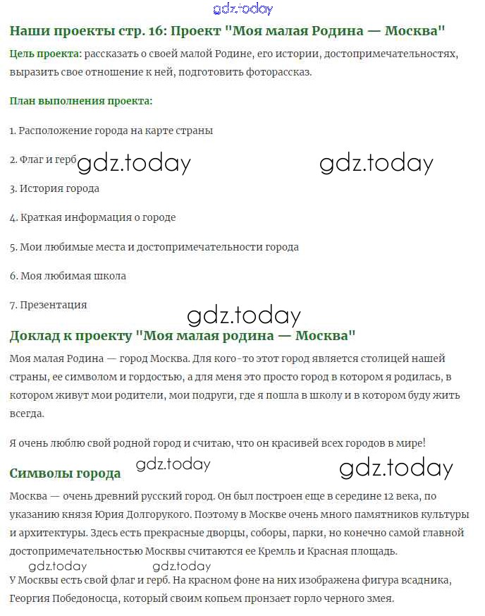 На страницах сайта gdz.today вы найдете учебный и вспомогательный материал, направленный на улучшения знаний школьной программы. ГДЗ - онлайн мир знаний Проекты (Моя малая Родина) стр 16 Решение к части 1 (Страниицы) Москва Учебнику по Окружающему миру для 1 класса Плешаков Просвещение Школа России 2017