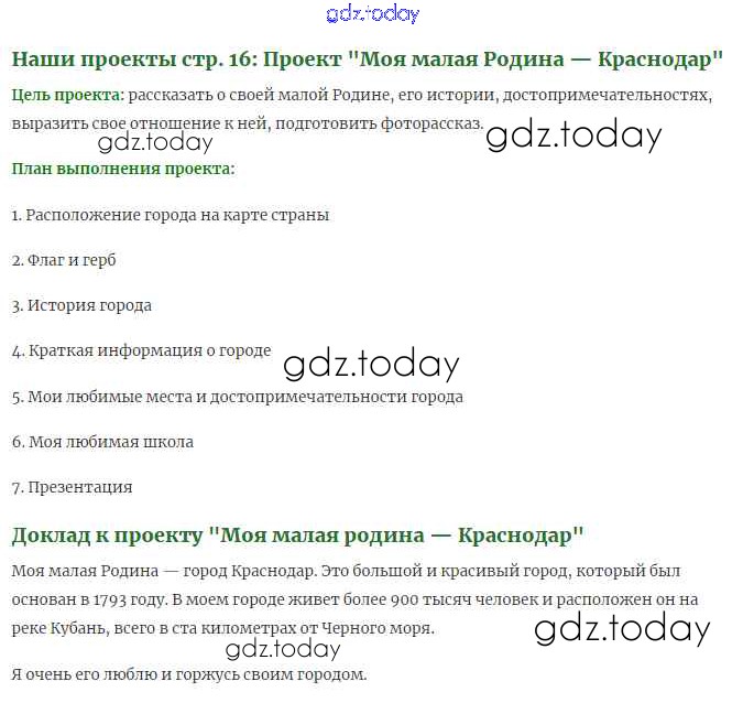 На страницах сайта gdz.today вы найдете учебный и вспомогательный материал, направленный на улучшения знаний школьной программы. ГДЗ - онлайн мир знаний Проекты (Моя малая Родина) стр 16 Решение к части 1 (Страниицы) Краснодар Учебнику по Окружающему миру для 1 класса Плешаков Просвещение Школа России 2017