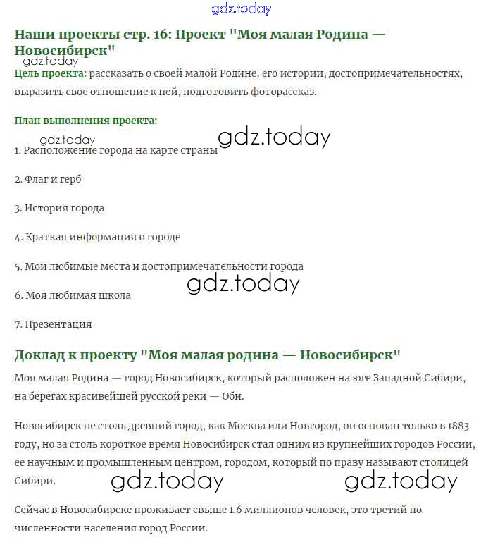 На страницах сайта gdz.today вы найдете учебный и вспомогательный материал, направленный на улучшения знаний школьной программы. ГДЗ - онлайн мир знаний Проекты (Моя малая Родина) стр 16 Решение к части 1 (Страниицы) Новосибирск Учебнику по Окружающему миру для 1 класса Плешаков Просвещение Школа России 2017