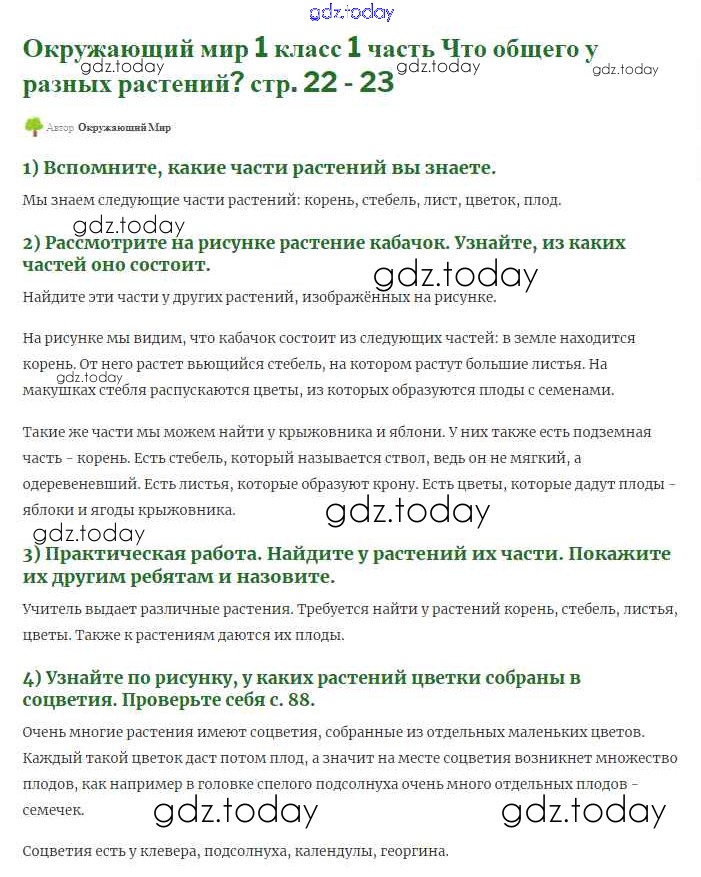 На страницах сайта gdz.today вы найдете учебный и вспомогательный материал, направленный на улучшения знаний школьной программы. ГДЗ - онлайн мир знаний Решение к части 1 (Страниицы) 22-23 Учебнику по Окружающему миру для 1 класса Плешаков Просвещение Школа России 2017