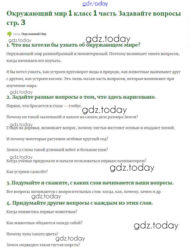 На страницах сайта gdz.today вы найдете учебный и вспомогательный материал, направленный на улучшения знаний школьной программы. ГДЗ - онлайн мир знаний Решение к части 1 (Страниицы) 3 Учебнику по Окружающему миру для 1 класса Плешаков Просвещение Школа России 2017