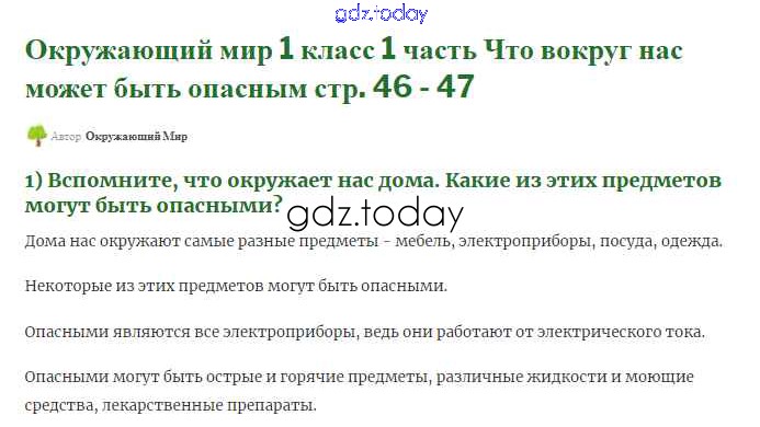 На страницах сайта gdz.today вы найдете учебный и вспомогательный материал, направленный на улучшения знаний школьной программы. ГДЗ - онлайн мир знаний Решение к части 1 (Страниицы) 46-47 Учебнику по Окружающему миру для 1 класса Плешаков Просвещение Школа России 2017
