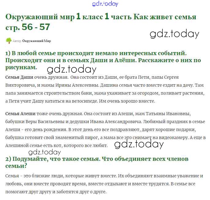 На страницах сайта gdz.today вы найдете учебный и вспомогательный материал, направленный на улучшения знаний школьной программы. ГДЗ - онлайн мир знаний Решение к части 1 (Страниицы) 56-57 Учебнику по Окружающему миру для 1 класса Плешаков Просвещение Школа России 2017