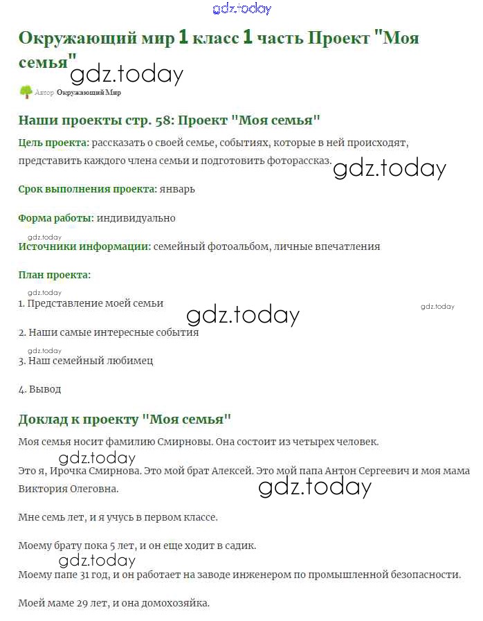 На страницах сайта gdz.today вы найдете учебный и вспомогательный материал, направленный на улучшения знаний школьной программы. ГДЗ - онлайн мир знаний Решение к части 1 (Страниицы) 58 (моя семья) Учебнику по Окружающему миру для 1 класса Плешаков Просвещение Школа России 2017