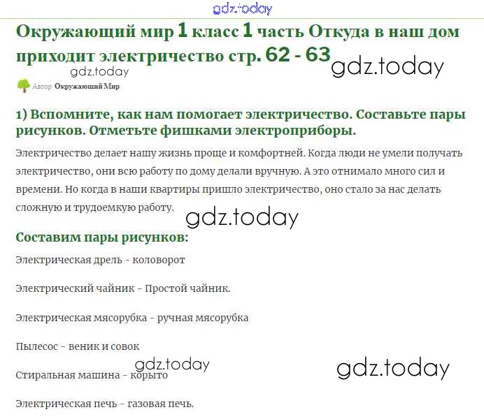 На страницах сайта gdz.today вы найдете учебный и вспомогательный материал, направленный на улучшения знаний школьной программы. ГДЗ - онлайн мир знаний Решение к части 1 (Страниицы) 62-63 Учебнику по Окружающему миру для 1 класса Плешаков Просвещение Школа России 2017
