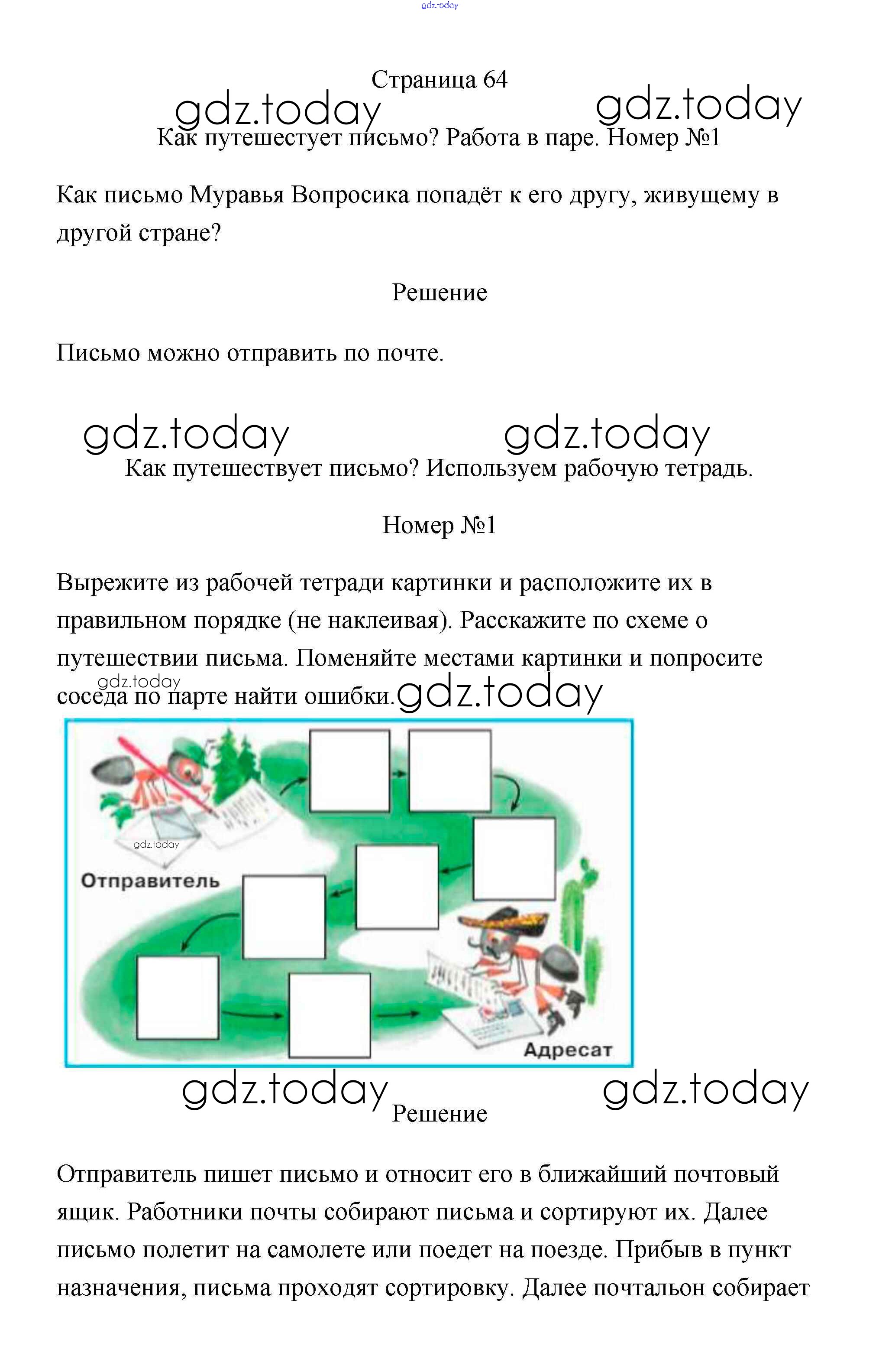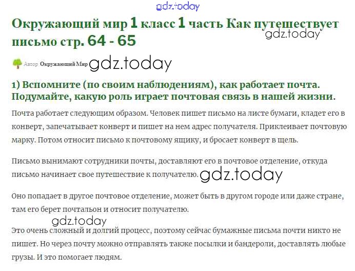На страницах сайта gdz.today вы найдете учебный и вспомогательный материал, направленный на улучшения знаний школьной программы. ГДЗ - онлайн мир знаний Решение к части 1 (Страниицы) 64-65 Учебнику по Окружающему миру для 1 класса Плешаков Просвещение Школа России 2017