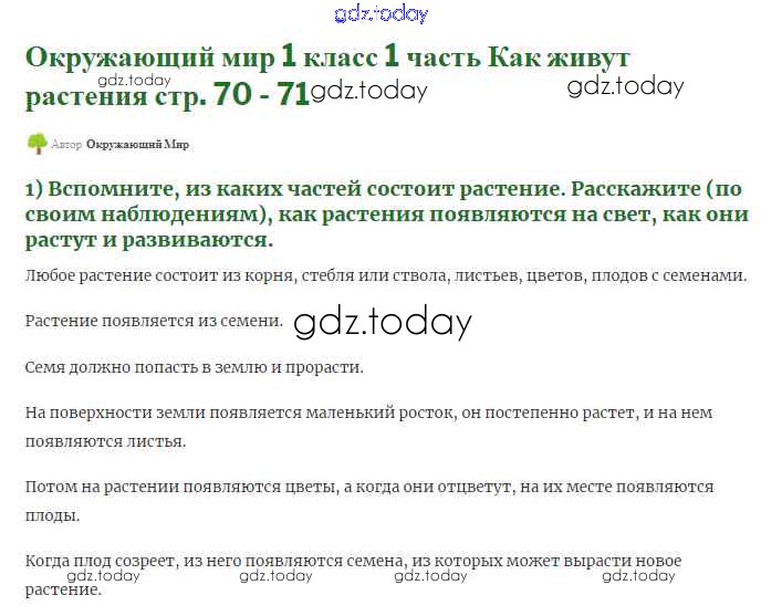 На страницах сайта gdz.today вы найдете учебный и вспомогательный материал, направленный на улучшения знаний школьной программы. ГДЗ - онлайн мир знаний Решение к части 1 (Страниицы) 70-71 Учебнику по Окружающему миру для 1 класса Плешаков Просвещение Школа России 2017