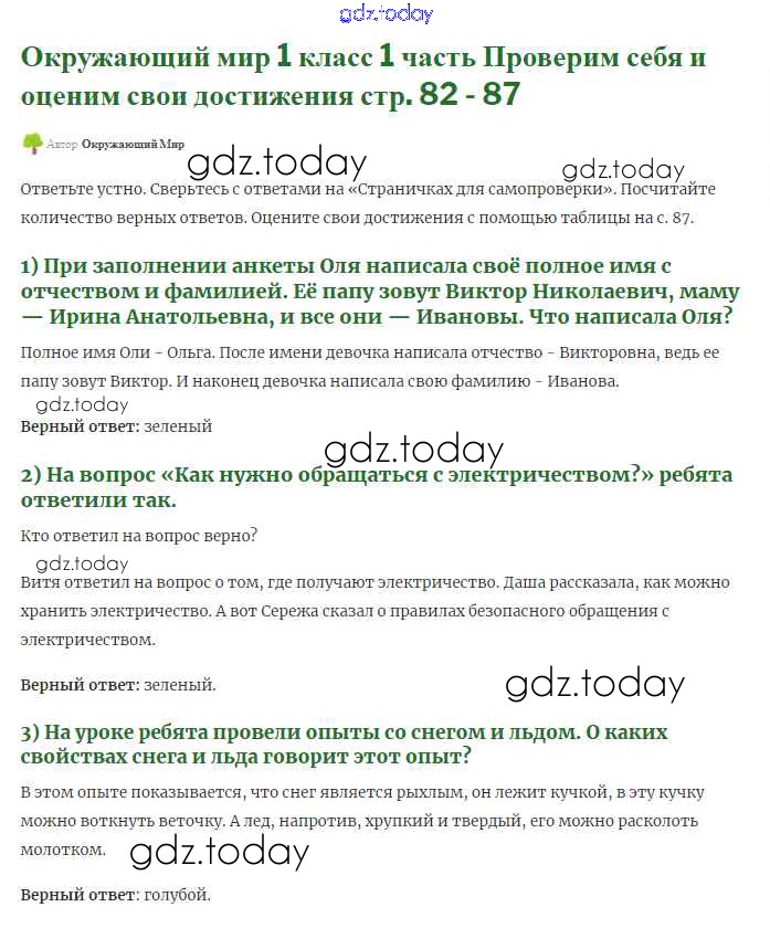 На страницах сайта gdz.today вы найдете учебный и вспомогательный материал, направленный на улучшения знаний школьной программы. ГДЗ - онлайн мир знаний Решение к части 1 (Страниицы) 82-87 Учебнику по Окружающему миру для 1 класса Плешаков Просвещение Школа России 2017