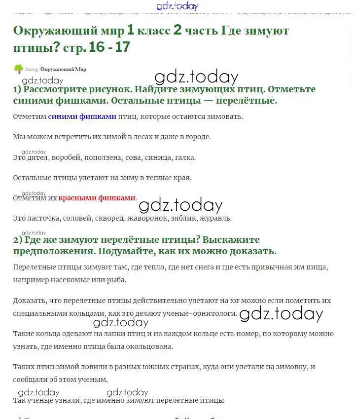 На страницах сайта gdz.today вы найдете учебный и вспомогательный материал, направленный на улучшения знаний школьной программы. ГДЗ - онлайн мир знаний Решение к части 2 (Страниицы) 16-17 Учебнику по Окружающему миру для 1 класса Плешаков Просвещение Школа России 2017
