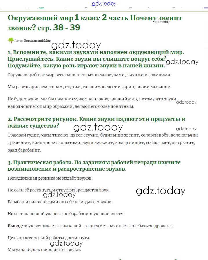 На страницах сайта gdz.today вы найдете учебный и вспомогательный материал, направленный на улучшения знаний школьной программы. ГДЗ - онлайн мир знаний Решение к части 2 (Страниицы) 38-39 Учебнику по Окружающему миру для 1 класса Плешаков Просвещение Школа России 2017