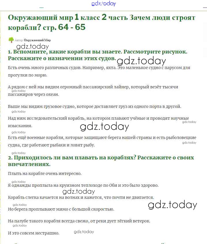 На страницах сайта gdz.today вы найдете учебный и вспомогательный материал, направленный на улучшения знаний школьной программы. ГДЗ - онлайн мир знаний Решение к части 2 (Страниицы) 64-65 Учебнику по Окружающему миру для 1 класса Плешаков Просвещение Школа России 2017