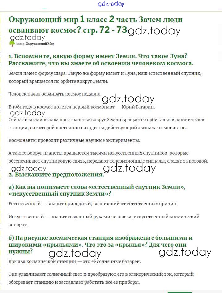 На страницах сайта gdz.today вы найдете учебный и вспомогательный материал, направленный на улучшения знаний школьной программы. ГДЗ - онлайн мир знаний Решение к части 2 (Страниицы) 72-73 Учебнику по Окружающему миру для 1 класса Плешаков Просвещение Школа России 2017