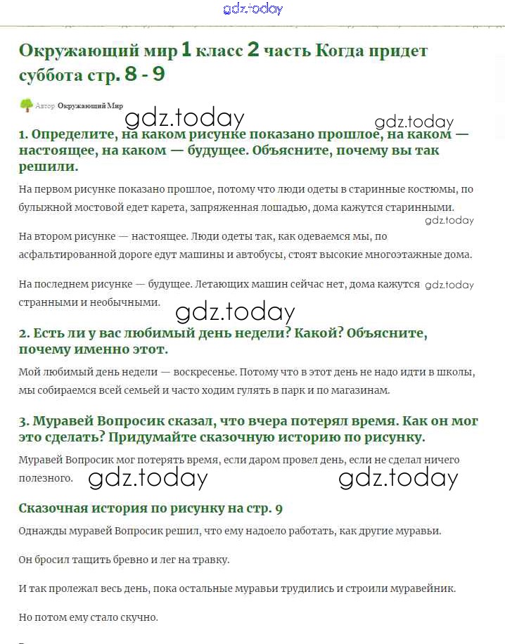На страницах сайта gdz.today вы найдете учебный и вспомогательный материал, направленный на улучшения знаний школьной программы. ГДЗ - онлайн мир знаний Решение к части 2 (Страниицы) 8-9 Учебнику по Окружающему миру для 1 класса Плешаков Просвещение Школа России 2017