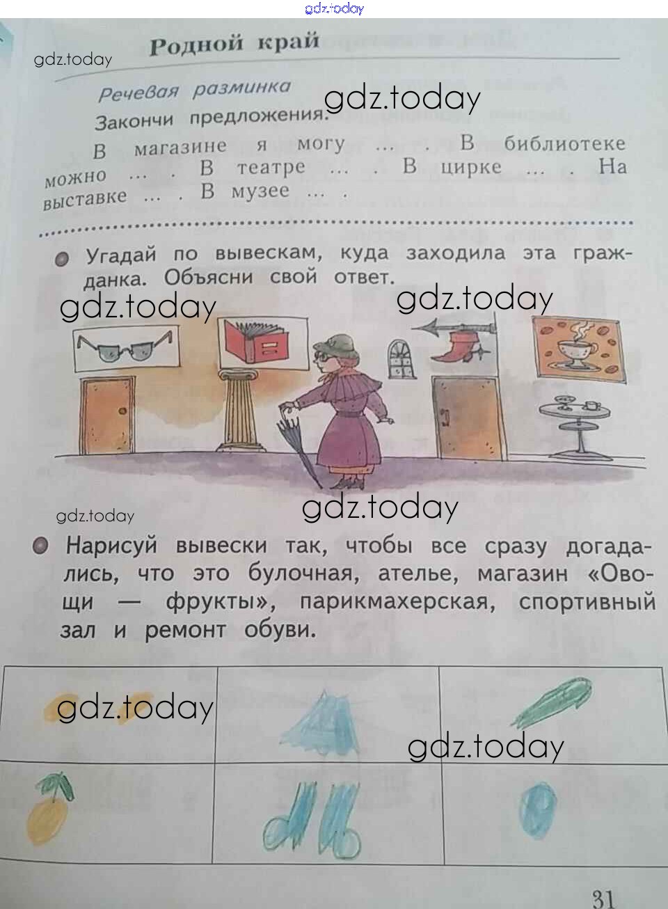 На страницах сайта gdz.today вы найдете учебный и вспомогательный материал, направленный на улучшения знаний школьной программы. ГДЗ - онлайн мир знаний Страницы (решение) 31 Рабочей тетради по Окружающему миру для 1 класса Виноградова Вентана-граф Начальная школа XXI века 2017