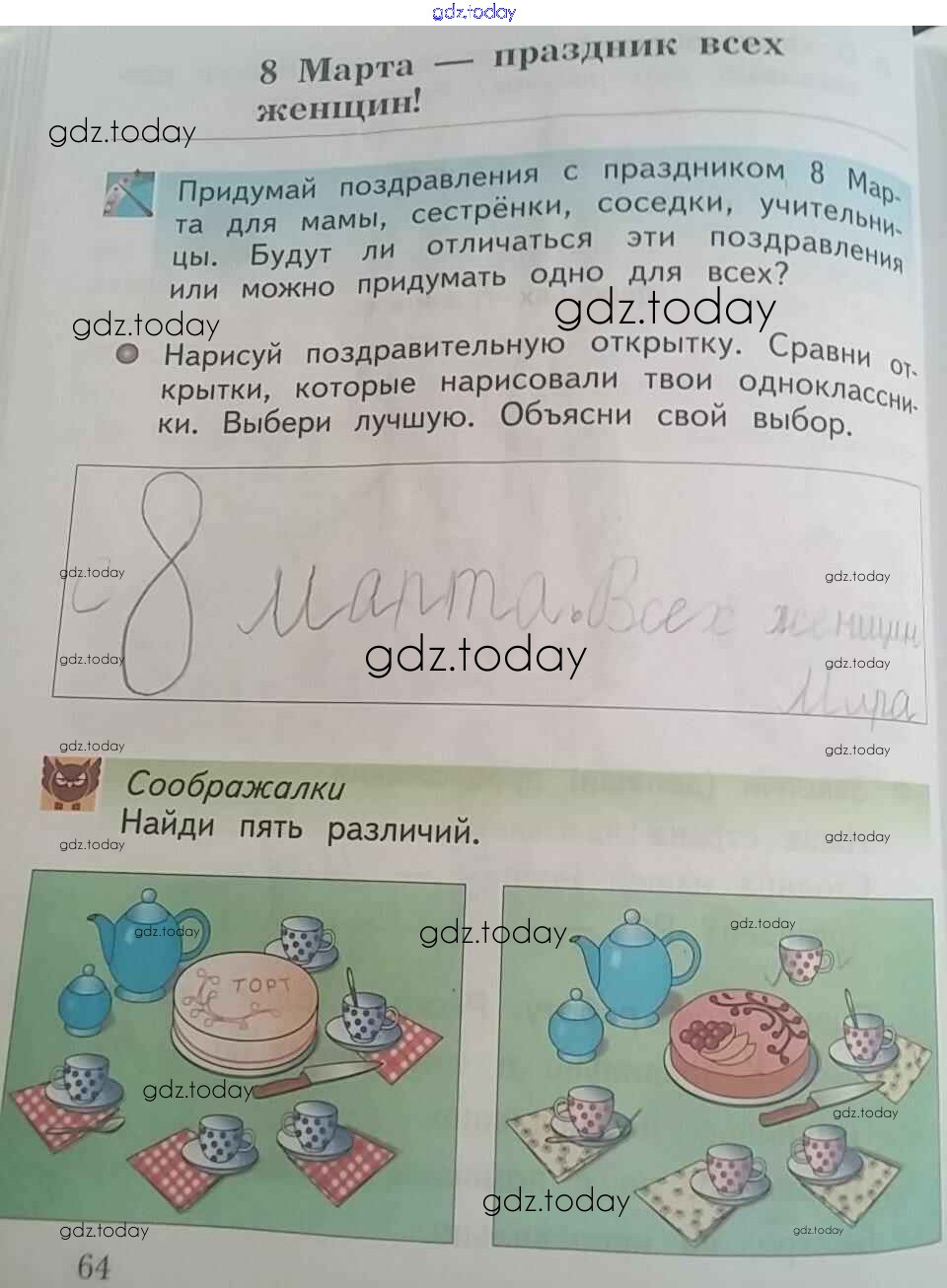 На страницах сайта gdz.today вы найдете учебный и вспомогательный материал, направленный на улучшения знаний школьной программы. ГДЗ - онлайн мир знаний Страницы (решение) 64 Рабочей тетради по Окружающему миру для 1 класса Виноградова Вентана-граф Начальная школа XXI века 2017