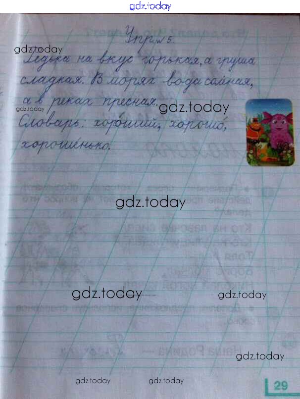 На страницах сайта gdz.today вы найдете учебный и вспомогательный материал, направленный на улучшения знаний школьной программы. ГДЗ - онлайн мир знаний Решение к части 2. Страницы 29 Рабочей тетради по Русскому языку для 1 класса Андрианова Дрофа Планета знаний 2017