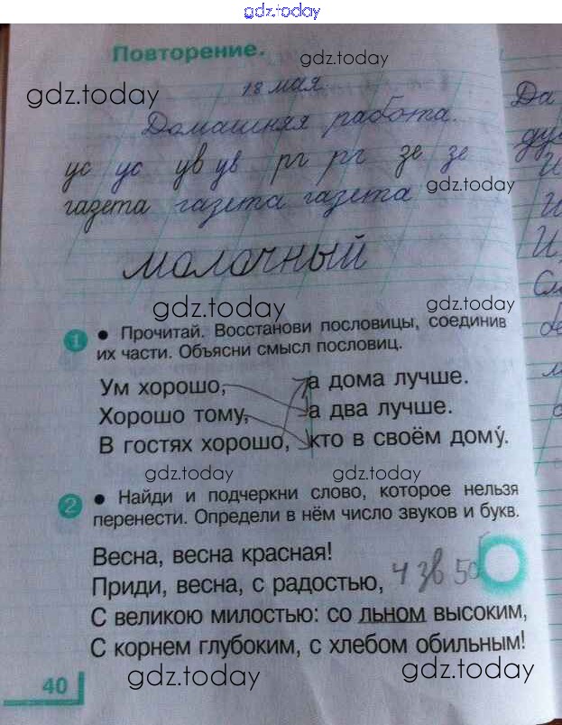 На страницах сайта gdz.today вы найдете учебный и вспомогательный материал, направленный на улучшения знаний школьной программы. ГДЗ - онлайн мир знаний Решение к части 2. Страницы 40 Рабочей тетради по Русскому языку для 1 класса Андрианова Дрофа Планета знаний 2017