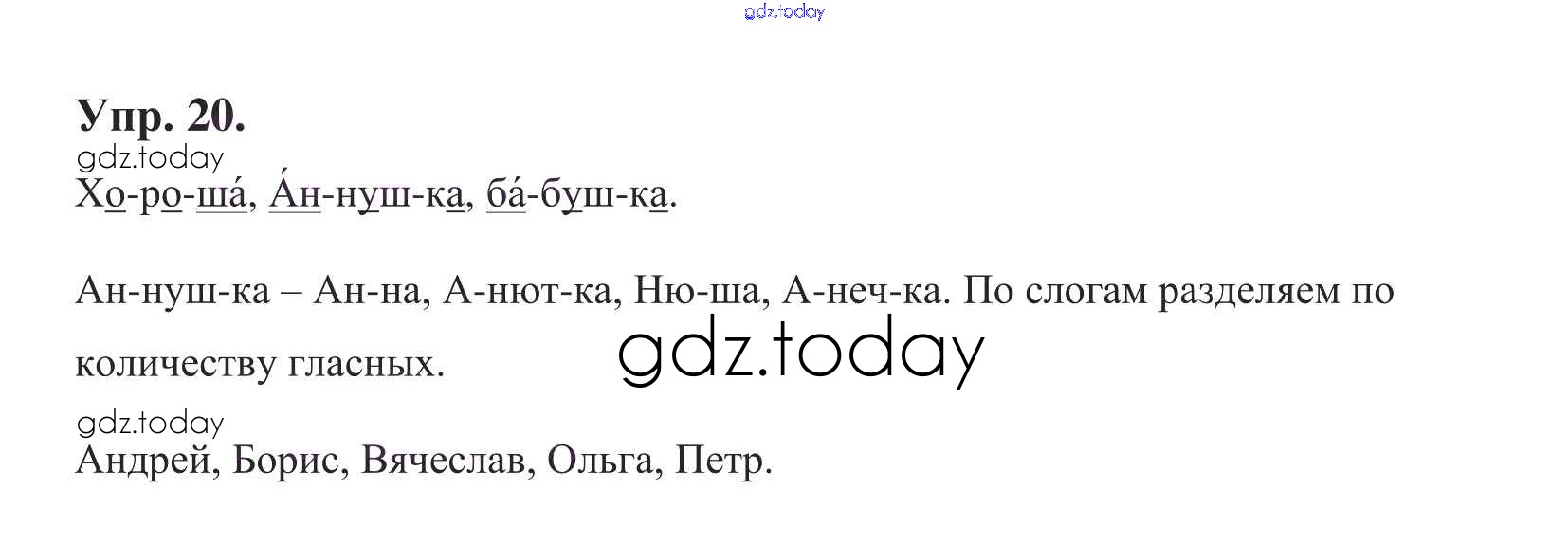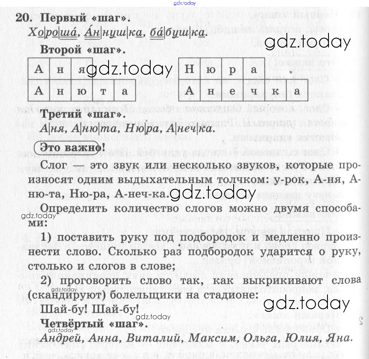 На страницах сайта gdz.today вы найдете учебный и вспомогательный материал, направленный на улучшения знаний школьной программы. ГДЗ - онлайн мир знаний Решение. Упражнения  20 Учебнику по Русскому языку для 1 класса Бунеев, Бунеева  Баласс Школа 2100 2016