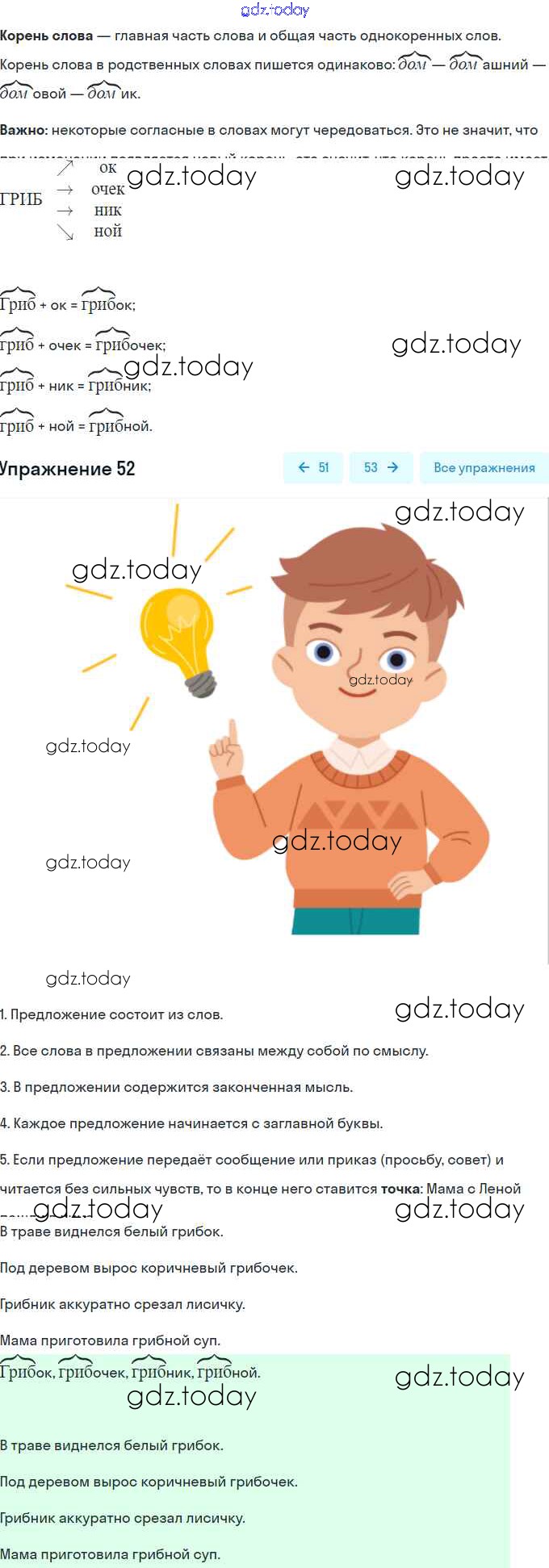 На страницах сайта gdz.today вы найдете учебный и вспомогательный материал, направленный на улучшения знаний школьной программы. ГДЗ - онлайн мир знаний Решение. Упражнения  52 Учебнику по Русскому языку для 1 класса Бунеев, Бунеева  Баласс Школа 2100 2016