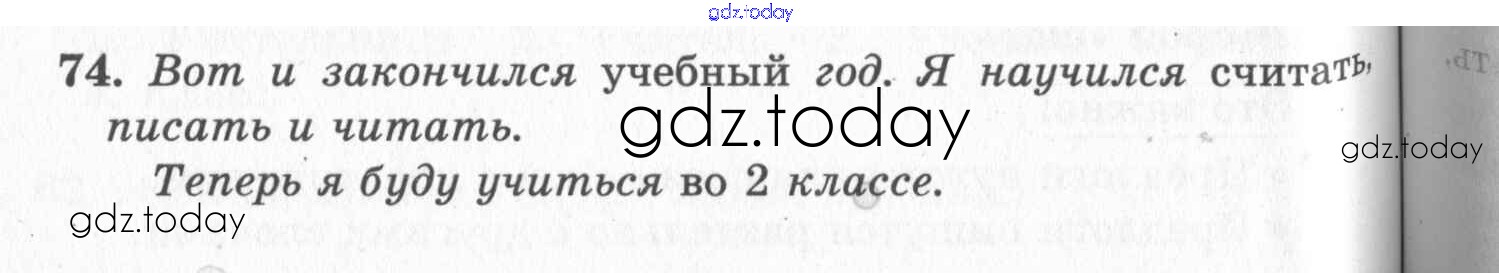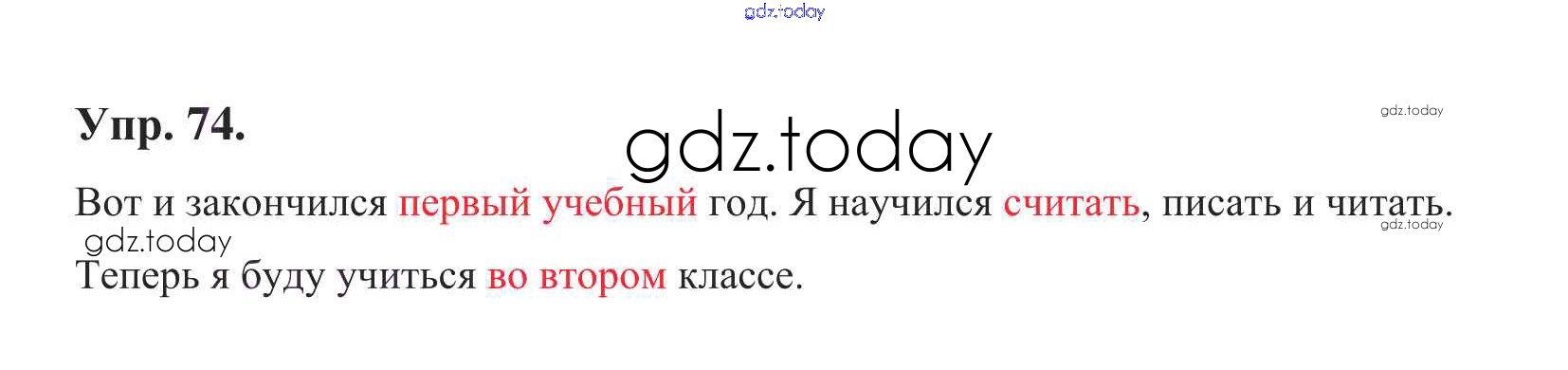 На страницах сайта gdz.today вы найдете учебный и вспомогательный материал, направленный на улучшения знаний школьной программы. ГДЗ - онлайн мир знаний Решение. Упражнения 74 Учебнику по Русскому языку для 1 класса Бунеев, Бунеева Баласс Школа 2100 2016