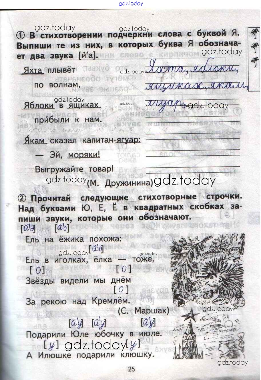 На страницах сайта gdz.today вы найдете учебный и вспомогательный материал, направленный на улучшения знаний школьной программы. ГДЗ - онлайн мир знаний Решение Страницы 25 Тетради для самостоятельной работы по Русскому языку для 1 класса Гольфман, Чуракова Академия Перспективная начальная школа 2016