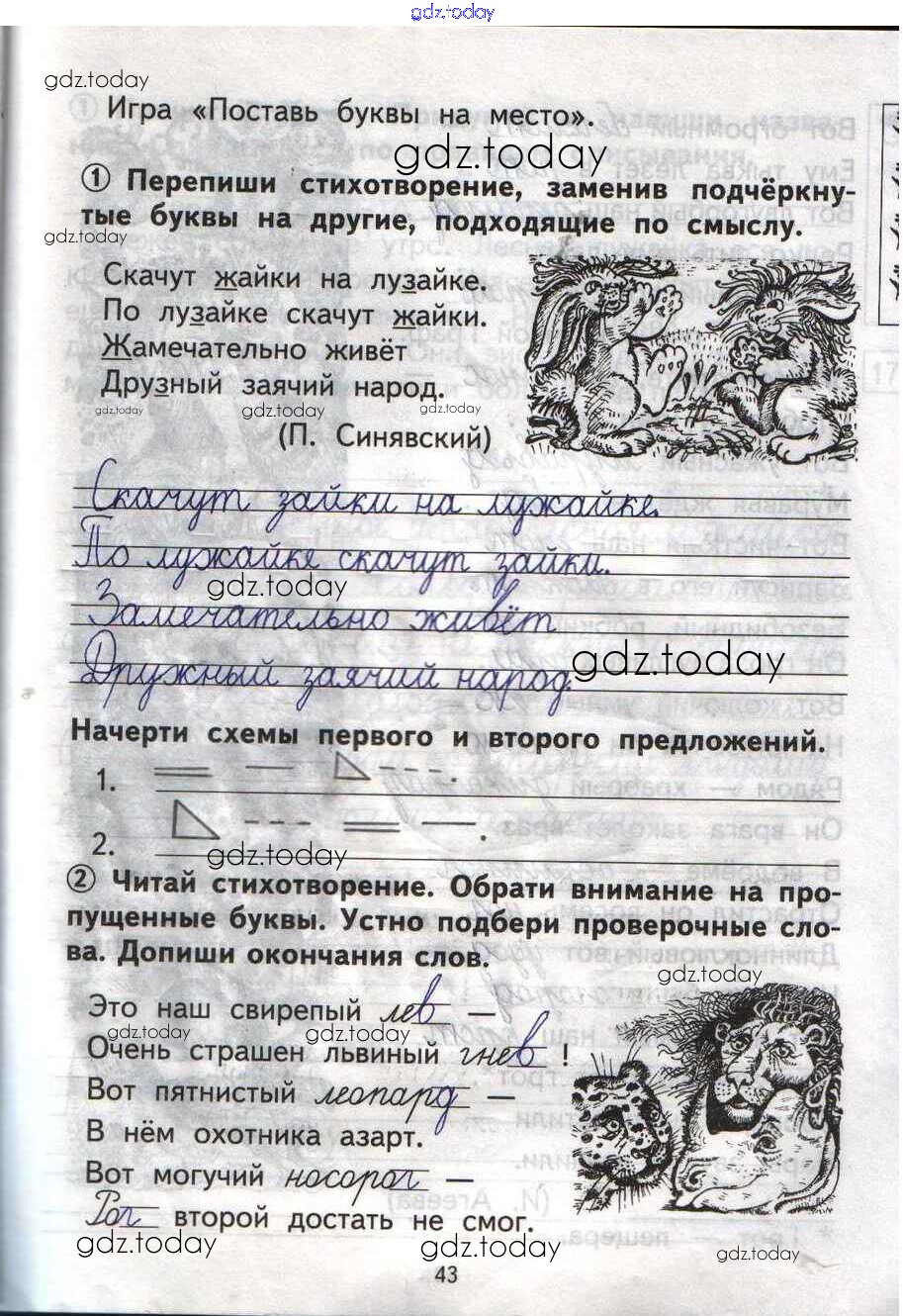 На страницах сайта gdz.today вы найдете учебный и вспомогательный материал, направленный на улучшения знаний школьной программы. ГДЗ - онлайн мир знаний Решение Страницы 43 Тетради для самостоятельной работы по Русскому языку для 1 класса Гольфман, Чуракова Академия Перспективная начальная школа 2016