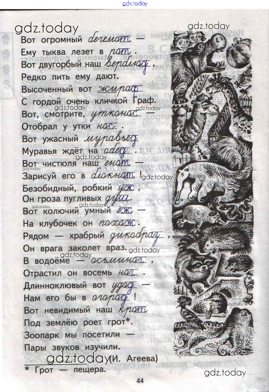 На страницах сайта gdz.today вы найдете учебный и вспомогательный материал, направленный на улучшения знаний школьной программы. ГДЗ - онлайн мир знаний Решение Страницы 44 Тетради для самостоятельной работы по Русскому языку для 1 класса Гольфман, Чуракова Академия Перспективная начальная школа 2016