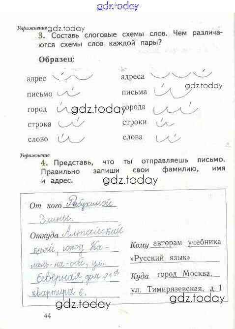 Ответы к Решение к тетради №1. Страницы 44 Рабочей тетради по Русскому языку для 1 класса Иванов, Евдокимова Вентана-граф Начальная школа XXI века 2016