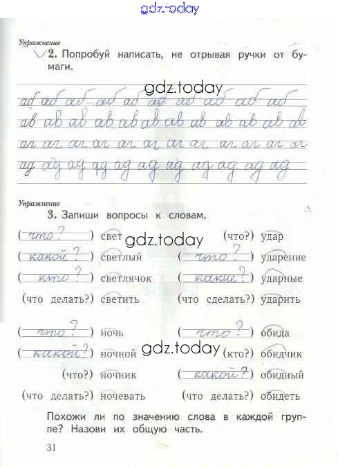 На страницах сайта gdz.today вы найдете учебный и вспомогательный материал, направленный на улучшения знаний школьной программы. ГДЗ - онлайн мир знаний Решение к тетради №2. Страницы 31 Рабочей тетради по Русскому языку для 1 класса Иванов, Евдокимова Вентана-граф Начальная школа XXI века 2016