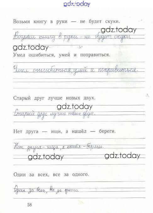 На страницах сайта gdz.today вы найдете учебный и вспомогательный материал, направленный на улучшения знаний школьной программы. ГДЗ - онлайн мир знаний Решение к тетради №2. Страницы 58 Рабочей тетради по Русскому языку для 1 класса Иванов, Евдокимова Вентана-граф Начальная школа XXI века 2016